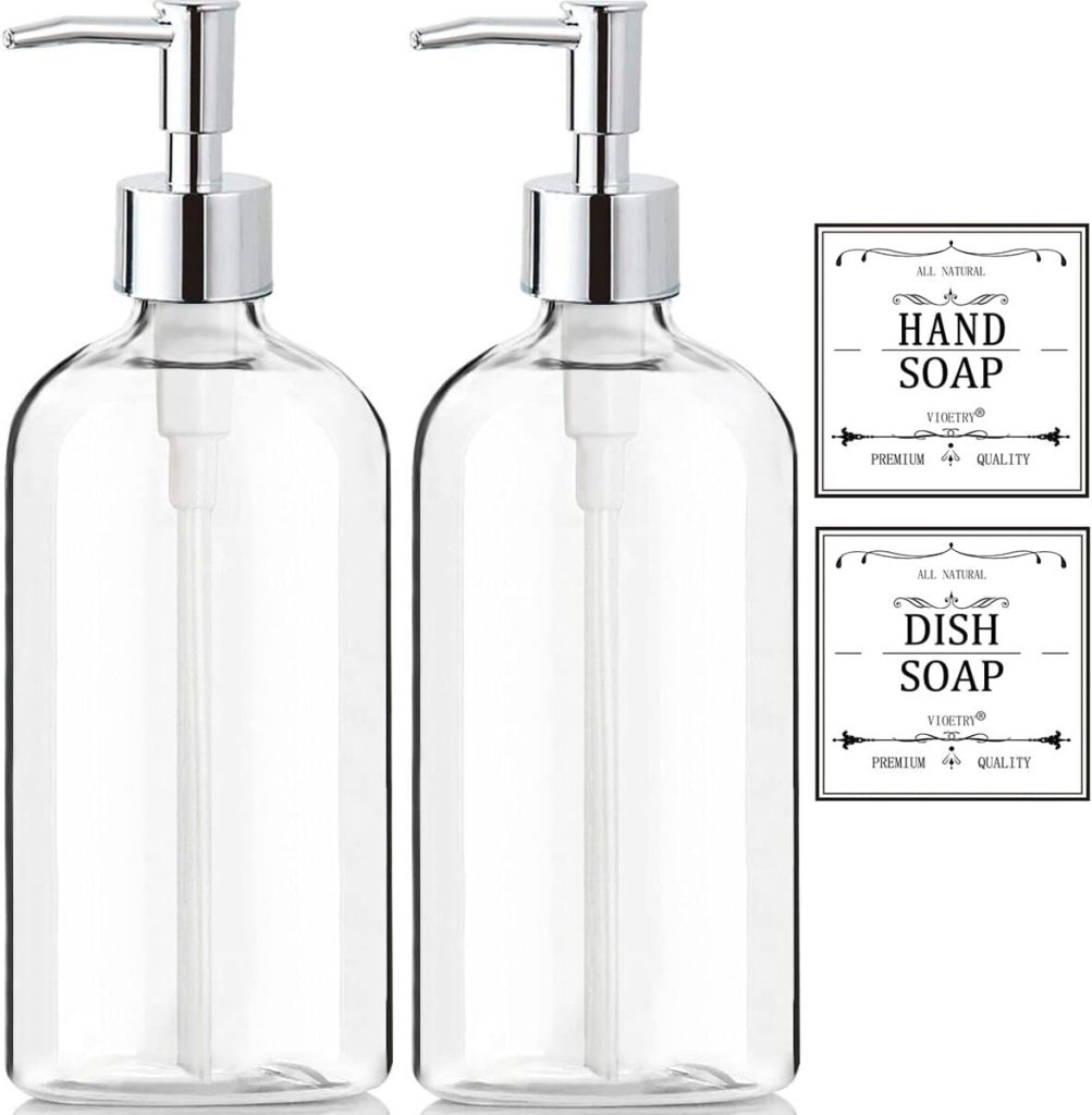 Clear Soap Dispenser with Rust Proof Pump, Waterproof Labels (2 Pack,16 Oz), Soap Dispenser Bathroom, Plastic Hand Soap Dispenser, Dish Soap Dispenser for Kitchen